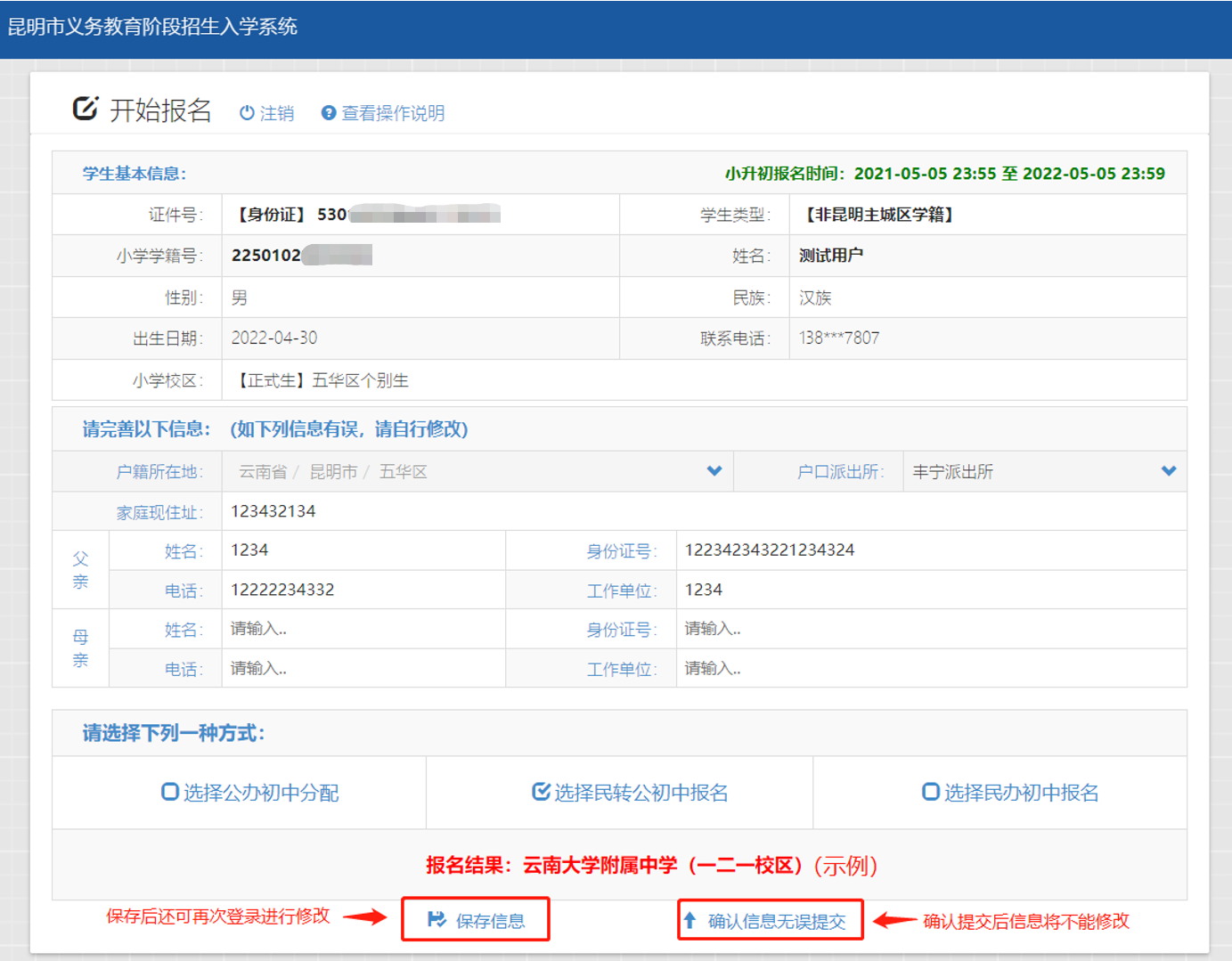 注意:请只点击了“保存信息”的学生及家长,在5月10日以前对信息进行核实修改,并点击“确认信息无误提交”。只有确认信息提交,并打印信息确认表,网上报名才算完成,否则将视为网上报名不成功。