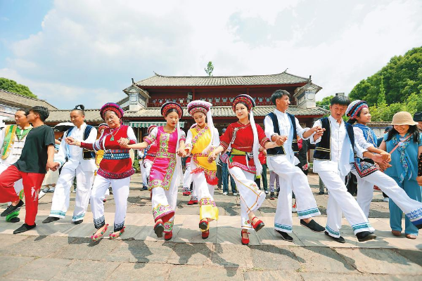 “五一”期间,云南民族村举办以“绕三灵民俗活动”为主题的白族民俗会系列活动,邀请广大游客欢聚民族村,体验白族文化展示、绕三灵巡游、三道茶体验等,活动将持续至5月5日。图为大家在欢乐打跳。