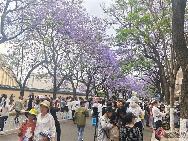 “五一”假期,蓝花楹是昆明当之无愧的“顶流”之一,在教场中路的一棵蓝花楹树下,来自湖南的武先生正在给手拿蓝花楹文创雪糕的女友拍照,武先生告诉记者:“这里太热闹了,盛开的蓝花楹真的很美,能拍到好看的照片,还是挺开心的。”随着蓝花楹的走红,其文创产品、文创雪糕也跟着火了一把,在道路两边有很多文创雪糕和文创产品的摊位,供游客挑选购买。
