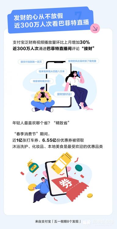 想发财的心也没有放假:五一期间,支付宝泛财商视频播放量环比上月增加30%,一夜之间更有近300万人次涌进巴菲特直播间评论“接财”。