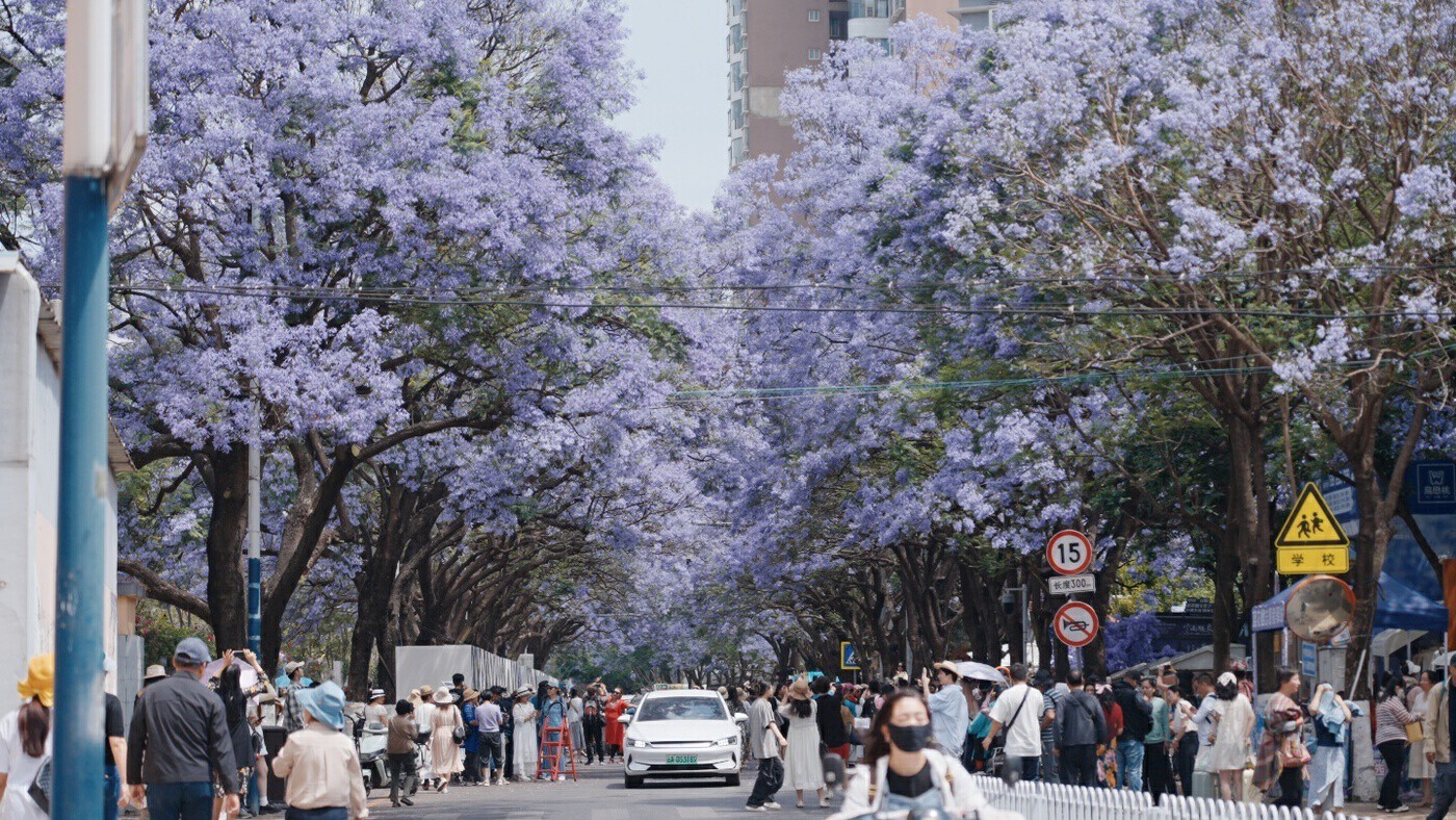 五一假期,云南昆明,盛开的蓝花楹成了人气“顶流”。