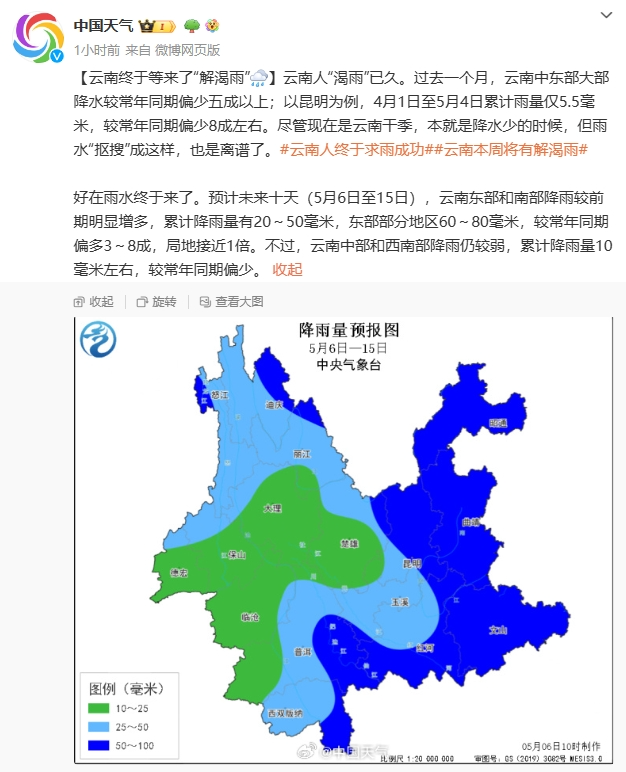 五一假期期间,昆明市零星降下几场小雨,虽然雨量不算大,但却让大家有了一种久旱逢甘霖般的凉爽。连官方都忍不住发文道:“云南终于等来了‘解渴雨’。”