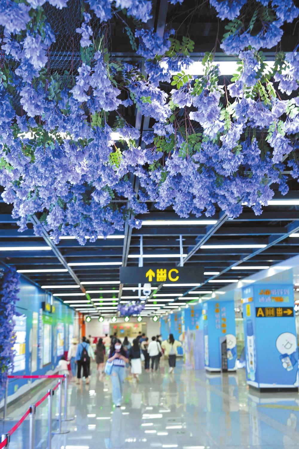 “五一”前夕,昆明地铁4号线从昆明南站开往金川路的蓝花楹主题地铁列车发车。运营方云南京建轨道将4号线苏家塘站打造成充满诗意与浪漫的紫色世界,在A出入口设置的蓝花楹打卡花墙栩栩如生,坐在一旁的凳子上,仿佛置身于教场中路上的蓝花楹中。地铁5号线也开启“花式整活”模式,车站突出翠湖文化和人民音乐家聂耳的故事,通过不同的置景,地铁站成为过去时光和现在场景的连接,游客可以透过艺术展示,去探寻昆明的历史文脉。
