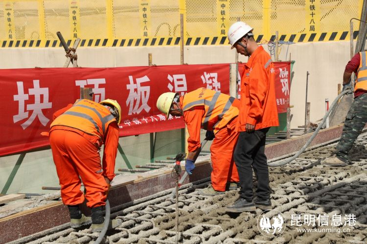 昆明信息港讯 记者上官艳君 记者从中国铁路昆明局集团有限公司(下称“国铁昆明局”)了解到,5月7日凌晨,经过建设者近40个小时的连续浇筑作业,渝昆高铁长水机场站明挖区间首块顶板顺利完成浇筑,这标志着车站明挖区间正式进入主体结构施工阶段,为长水机场隧道进口贯通,以及渝昆高铁早日建成通车奠定了坚实基础。