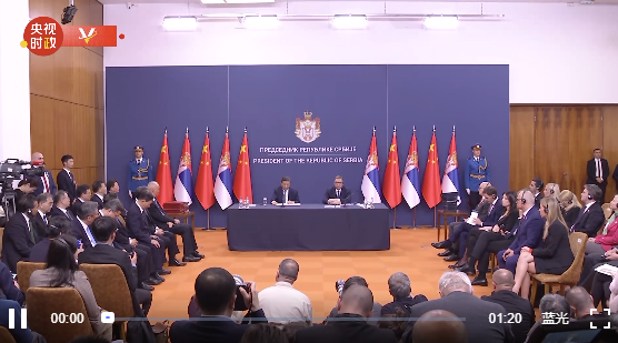 当地时间5月8日中午,国家主席习近平在贝尔格莱德塞尔维亚大厦同塞尔维亚总统武契奇会谈后共同会见记者。