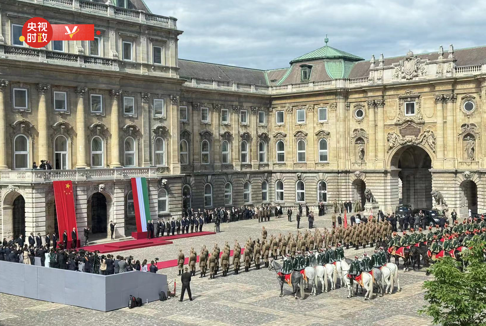 初夏时节的布达佩斯阳光明媚,古老宏伟的布达王宫庄严矗立,中匈两国国旗相映成辉。