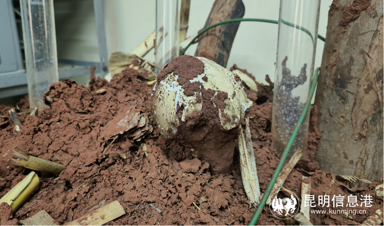 日前,昆明市林业和草原科学研究所实验室培育的人工白蚁巢出了第一朵鸡枞菌,据统计,这是目前昆明市实验室人工培育条件下实现的首次鸡枞菌出菇案例。