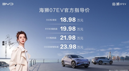 定位于“中型都市智电SUV”的海狮07 EV正式上市,官方指导价格18.98万元-23.98万元。海狮07EV是e平台3.0Evo打造的首款车型,搭载12项全球首创硬核技术,拥有超100项全系标配,集安全、舒适、智能、性能、效率、颜值于一身,是比亚迪海洋网为新生代都市用户打造,汇集了领先技术与前瞻设计的创新力作。