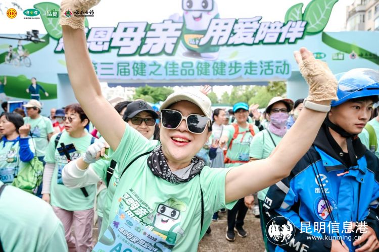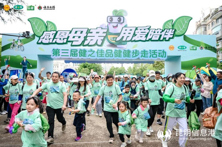 初夏的昆明城,蓝花楹映水盛开,5月12日,“感恩母亲,用爱陪伴”第三届健之佳品健健步走活动在桃源码头广场举行。当天,500多位市民在云南本土奥运冠军郭伟阳带领下,用脚步丈量城市美好,让身心感受幸福春城。