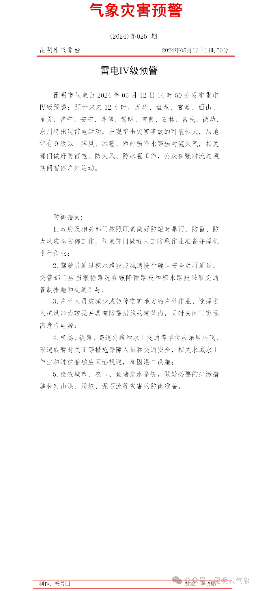 5月12日,昆明市气象台发布雷电IV级预警,预计未来12小时,五华、盘龙、官渡、西山、呈贡、晋宁、安宁、寻甸、嵩明、宜良、石林、富民、禄劝、东川将出现雷电活动。以下为详细内容↓
