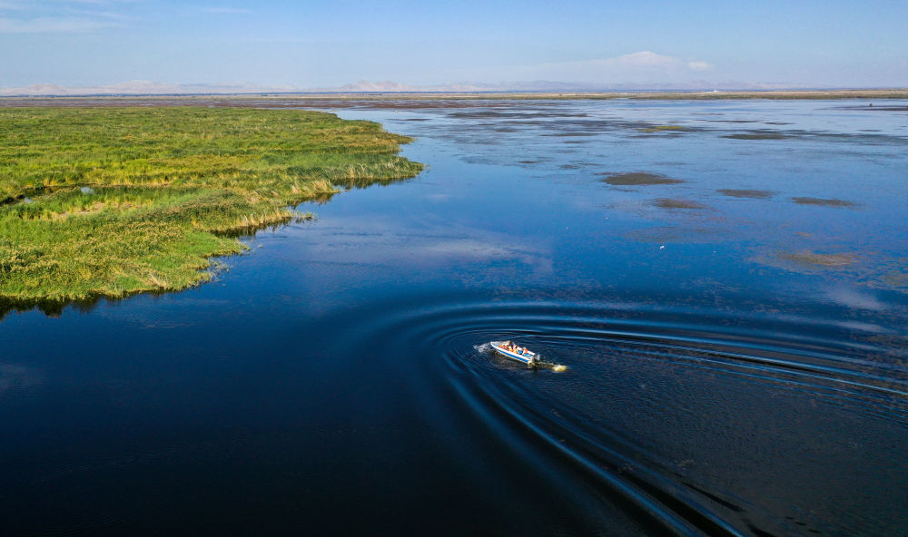 在内蒙古乌梁素海湖面上,河湖湿地水环境保护与修复技术研究团队成员乘坐快艇去采集湖水样本(2023年9月15日摄,无人机照片)。新华社记者 连振 摄