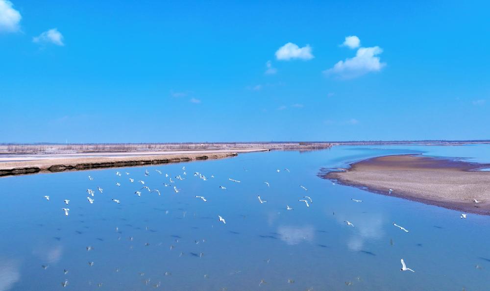 在黄河宁夏段,候鸟在滩涂上空飞翔(2024年3月1日摄,无人机照片)。新华社记者 王鹏 摄