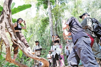 今年以来,景洪市基诺山乡的雨林徒步游成为市民和游客的热捧项目,人们在徒步中享受亲近自然的乐趣。图为游客在巴朵村的雨林中拍照。(李云生)