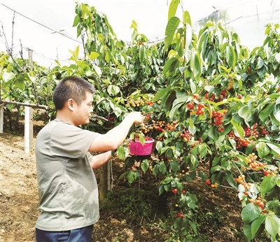 在大鹿山海拔1800米的山顶区域,于应贵家的樱桃采摘园远远看去红彤彤的一片,一颗颗樱桃色泽艳丽、汁多味甜。采摘的游客们手提小篮子,一边说笑一边采摘,不一会儿就收获满满。“来的人还是挺多的,游客到园里采摘是15元一斤,今年的樱桃产量预计在3吨左右,产值在4.5万元左右。”于应贵说。