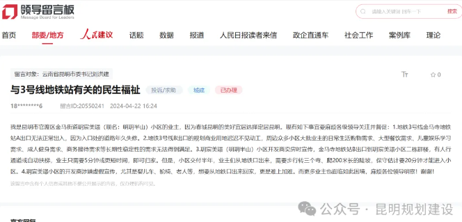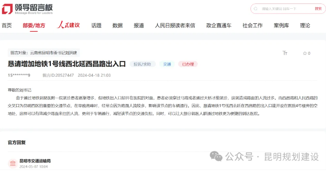 对于网友在人民网领导留言板上关于“明玥半山小区坐地铁问题”及“建议在西昌路新增地铁出入口”的留言,昆明市有关部门于近日分别进行了回复。