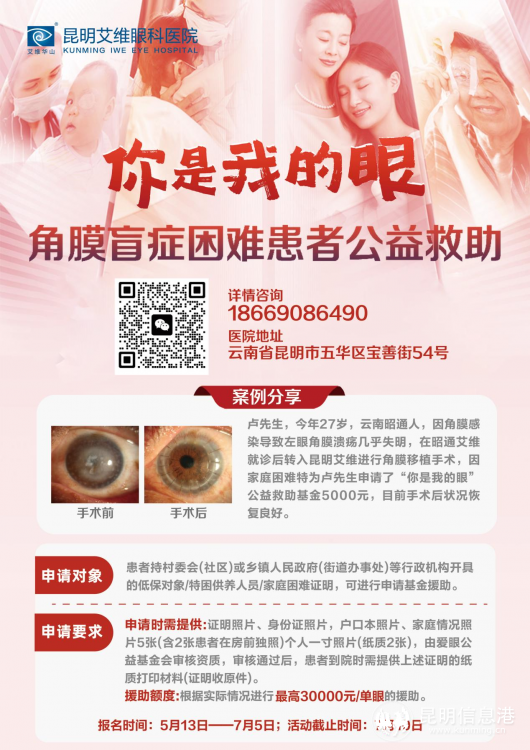 目前,该公益计划面向云南地区招募角膜盲症困难患者,符合条件的患者持相应的困难证明可申请援助。援助额度根据实际情况核批,最高金额30000元/单眼。此次活动报名截止时间为2024年7月5日,有意者可尽快到昆明艾维眼科医院报名。
