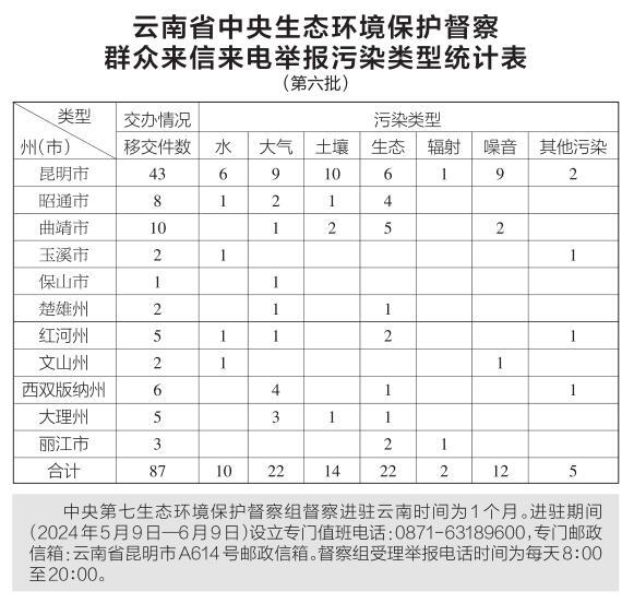 5月15日,中央第七生态环境保护督察组向云南移交第六批群众信访举报件87件,其中来电举报53件,来信举报34件。从信访举报件生态环境问题污染类型来看,涉及水10件、大气22件、土壤14件、生态22件、辐射2件、噪音12件、其他污染5件。从区域分布上看,昆明市43件、昭通市8件、曲靖市10件、玉溪市2件、保山市1件、楚雄州2件、红河州5件、文山州2件、西双版纳州6件、大理州5件、丽江市3件。截至当日,云南省已累计收到中央第七生态环境保护督察组交办的信访举报件404件,所有举报件均已及时转交相关州(市)处理。