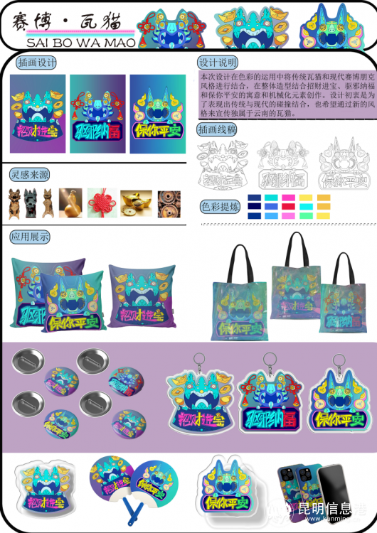 创作者们围绕呈贡代表性传统文化元素进行创作,云南民族大学学生刀啟丽的赛博瓦猫,创作出抱枕、帆布包、钥匙扣、手机壳等产品,从各角度展现瓦猫IP的产品成果转化。在色彩的运用中将传统瓦猫和现代赛博朋克风格进行结合,在整体造型结合“招财进宝”、“驱邪纳福”和“保你平安”的寓意和机械化元素创作,创新风格来宣传瓦猫。