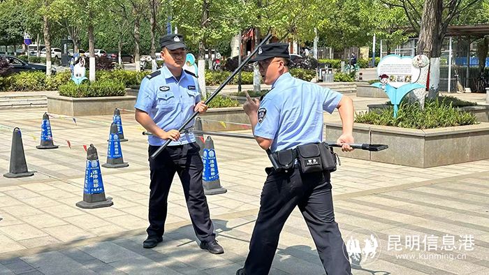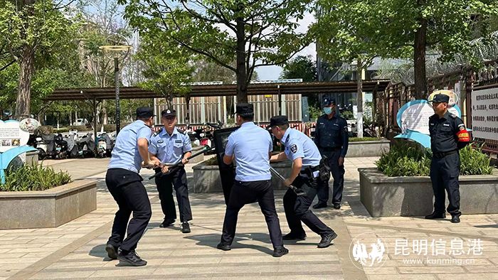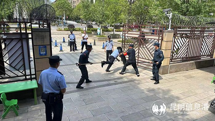 昆明信息港讯 记者上官艳君 5月23日15时30分,一名可疑男子在昆明市度假区第一幼儿园门口持续徘徊,并利用门卫开门时机,持械冲入幼儿园实施暴恐行为。安保人员发现情况后,立即启动“一键报警”装置,随即手持防暴盾牌、钢叉、长棍等工具组成防卫阵型与“歹徒”周旋。民警赶到现场,利用警务战术对“歹徒”进行围捕,仅2分钟时间,便成功将“歹徒”控制并带离现场。