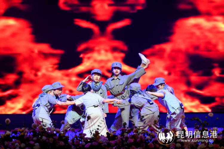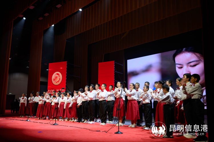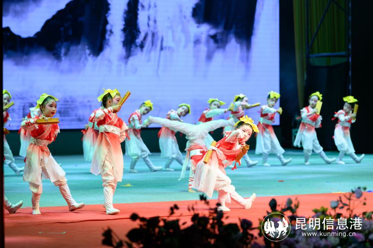 舞台上,13个获奖节目轮番上演,学生们通过合唱、群舞、朗诵、戏剧等多种艺术形式,展示了昆明市中小学生及幼儿积极乐观向上的精神风貌,彰显了学校及幼儿园美育教育改革发展新成果,发挥了典型示范引领作用。昆明青少年活动中心石榴籽童声合唱团还演唱了《打歌来》《满城烟花》。