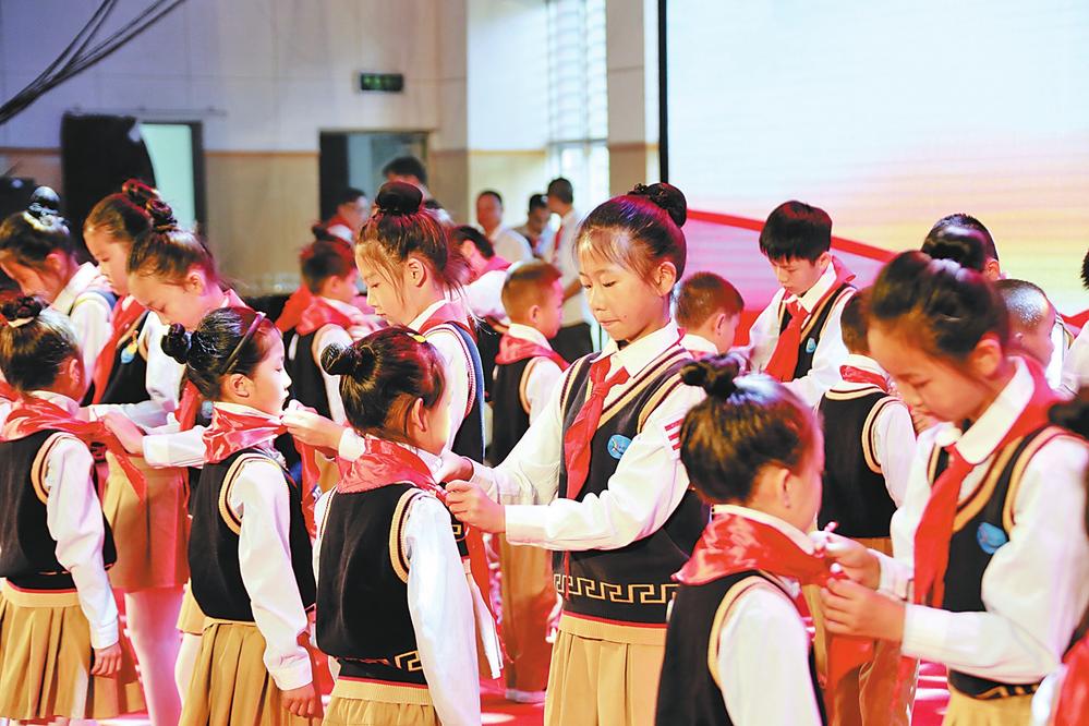 在主题队日活动上,盘龙区对2023年少先队集体和优秀个人进行了表扬。在少先队新队员代表集中入队仪式上,老队员为新队员佩戴红领巾,传递责任和使命。(云南日报 记者王琼梅 通讯员张晓燕)