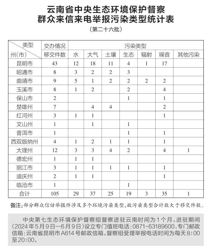 6月4日,中央第七生态环境保护督察组向云南移交第二十六批群众信访举报件105件,其中来电举报52件,来信举报53件。从信访举报件生态环境问题污染类型来看,涉及水29件、大气37件、土壤25件、生态19件、辐射3件、噪音35件、其他污染1件。从区域分布上看,昆明市43件、昭通市8件、曲靖市9件、玉溪市8件、保山市2件、楚雄州7件、红河州3件、文山州1件、普洱市1件、西双版纳州4件、大理州12件、德宏州1件、丽江市3件、迪庆州2件、临沧市1件。截至当日,云南省已累计收到中央第七生态环境保护督察组交办的信访举报件2485件,所有举报件均已及时转交相关州(市)处理。