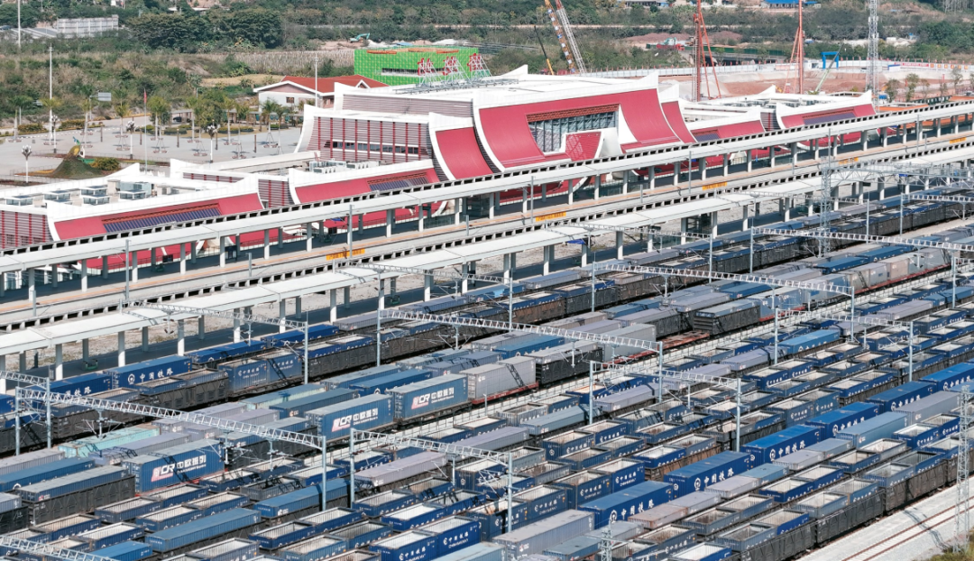 中老铁路货物运输覆盖老挝、泰国、越南、缅甸等12个共建“一带一路”国家,已成为联通内外、辐射周边、双向互济、安全高效的国际物流黄金大通道。磨憨铁路口岸已成为我国对东盟的第一大铁路口岸。图为中老铁路磨憨站,一列列国际货物列车整装待发。中国铁路昆明局集团供图