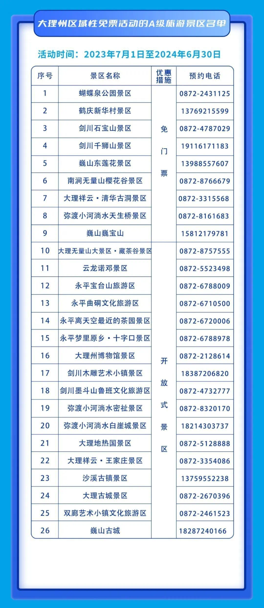 6月1日—6月30日,以上景区针对大理州云龙县居民,云南省玉溪市、曲靖市、普洱市居民及国内内蒙古、江苏、湖北、贵州、福建、浙江居民,免门票。