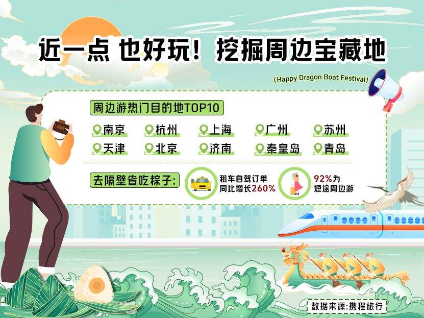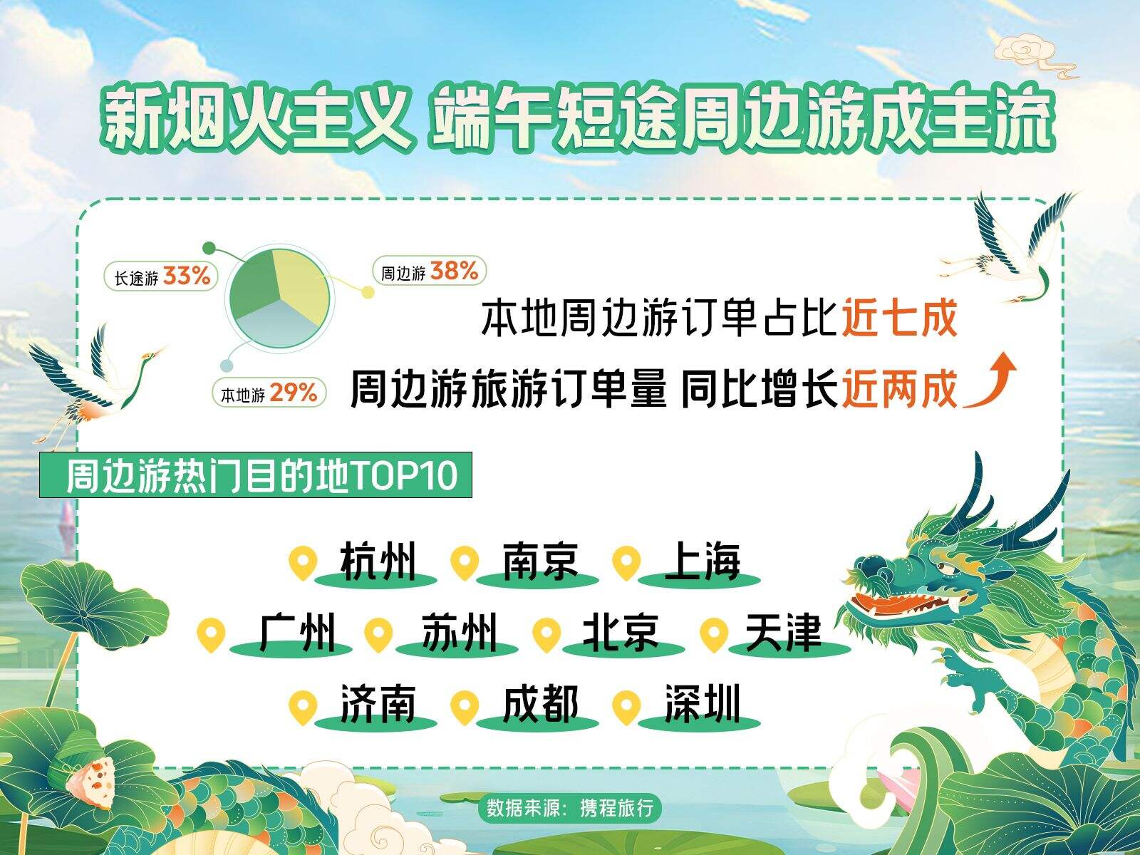 受端午假期“前后不接”难拼假、以及居民常态化旅游的影响,周边短途游或 “家门口旅行”又开始“香”了。携程端午报告显示,周边游及本地游订单占据假日近7成旅游订单;端午周边游预订量同比去年增长近两成。杭州、南京、上海、广州、苏州、北京、天津、济南、成都、深圳位列周边游热门目的地前十。