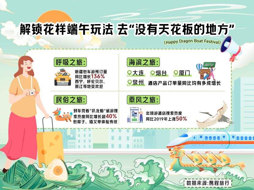 6月10日,携程发布的《2024年端午节出游报告》显示,今年端午假日周边游、本地游再度受青睐;国内游、出境游人次相比去年均有相应提升;传统民俗吸引更多外国游客前来体验,端午入境游预订量同比增长115%。