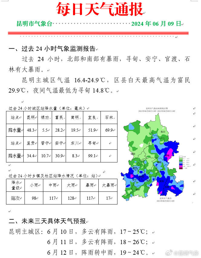 06月10日20时到06月11日20时:文山州南部、红河州南部、普洱市、西双版纳州、临沧市东部、德宏州西部阴有中到大雨局部暴雨,其他地区多云有阵雨局部中雨。