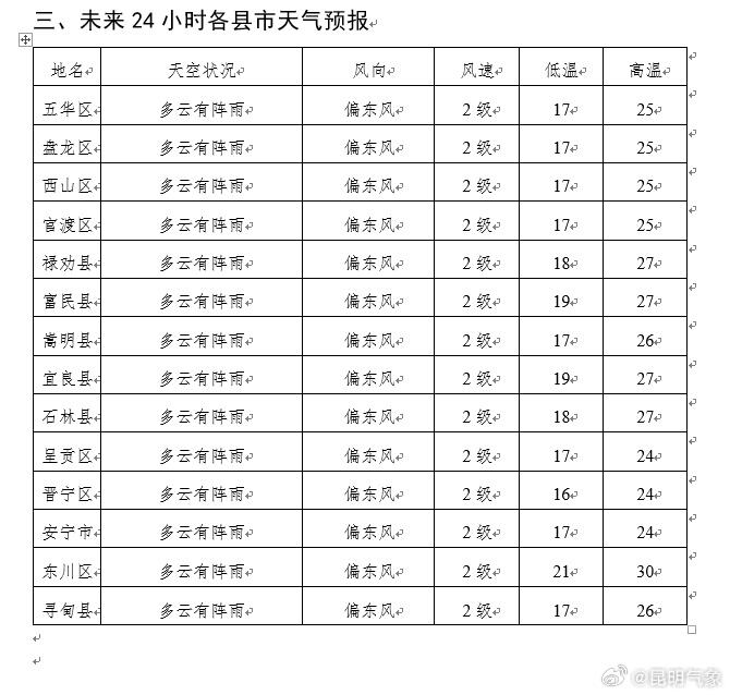 06月11日20时到06月12日20时:昭通市南部、曲靖市、文山州北部、昆明市北部、楚雄州北部、丽江市东部、红河州西部、普洱市、临沧市、保山市、德宏州阴有中到大雨局部暴雨,其他地区多云有阵雨局部中雨。