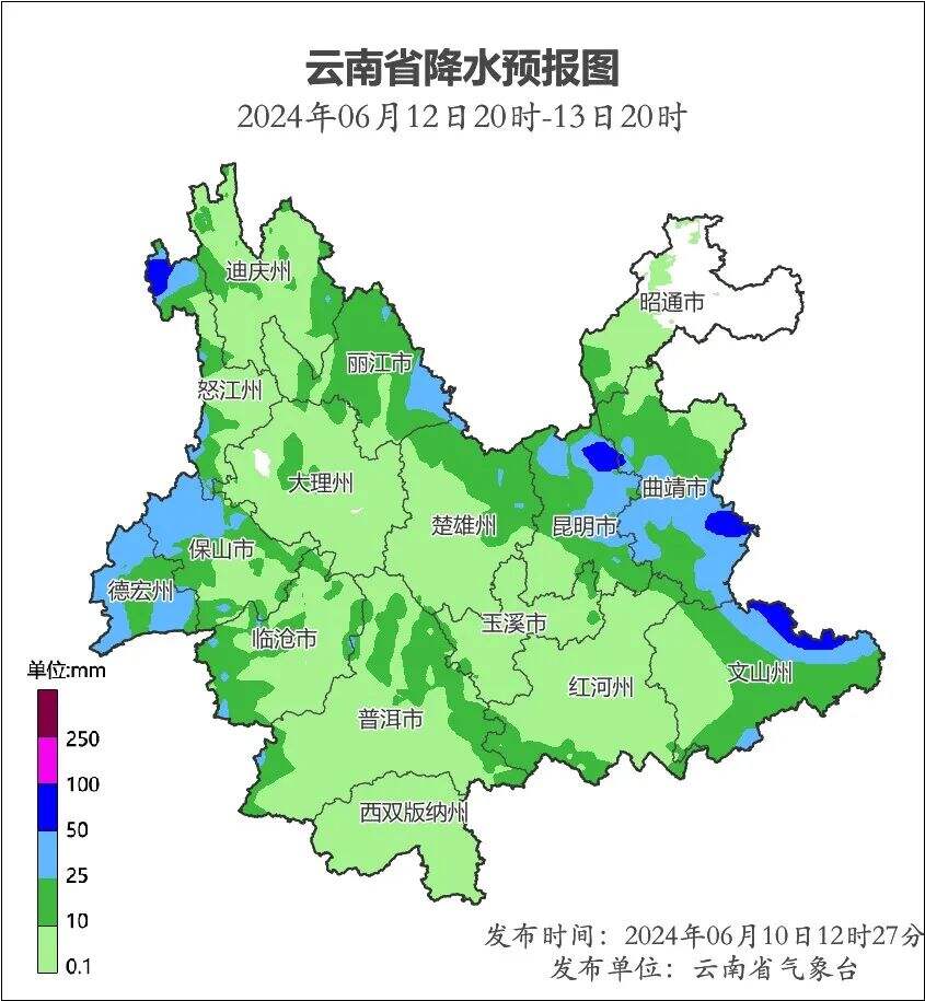 6月10日至12日,昭通市、曲靖市、昆明市北部(东川区、禄劝县)、楚雄州北部(大姚县、永仁县、元谋县)、丽江市东部(华坪县)、红河州南部(金平县、绿春县、屏边县、河口县)、普洱市南部(江城县、思茅区、孟连县、澜沧县、西盟县)、西双版纳州、临沧市西部(镇康县、耿马县、沧源县)、德宏州西部(盈江县)、保山市西部(腾冲市)、怒江州北部(贡山县)有中到大雨局部暴雨。