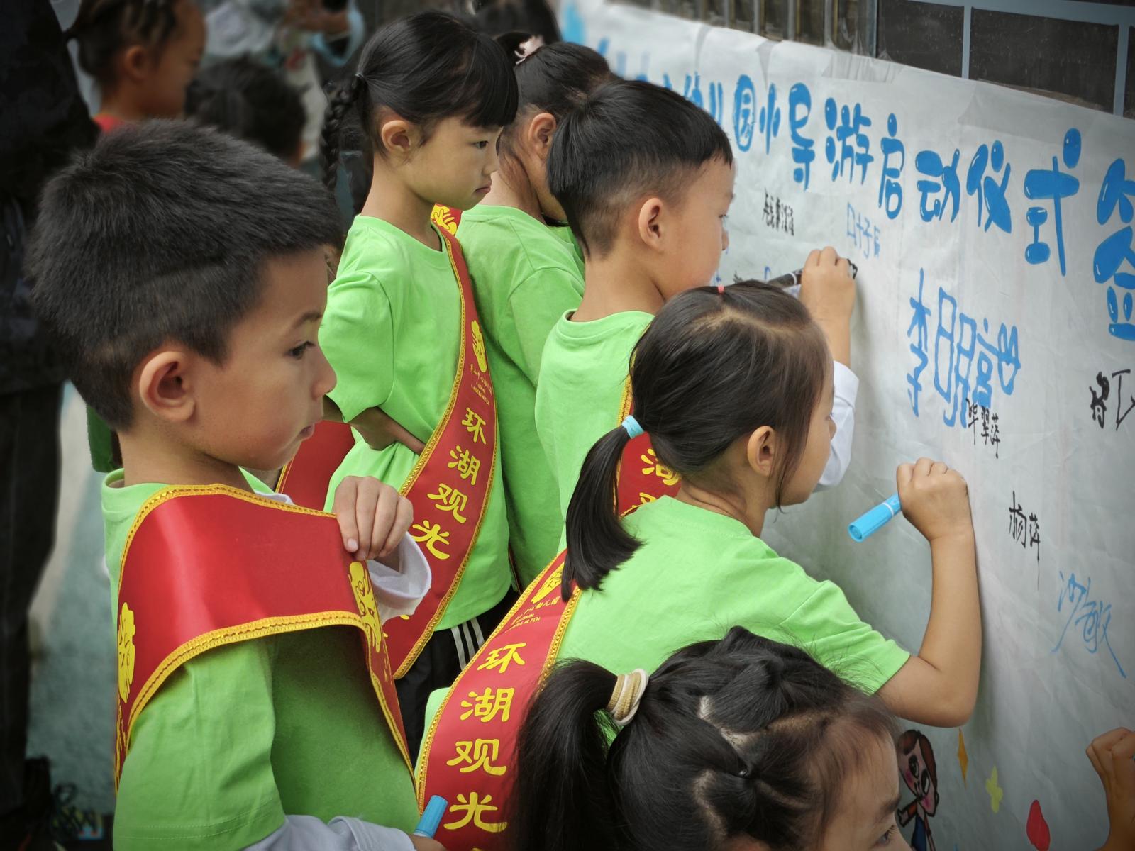 当天,萌娃“导游”们手持彩旗,身披绶带,分坐在10辆观光车上,先后前往赵家大沟、杞麓湖国家湿地公园、藻水分离站、马家湾出水口等地,用稚嫩的童音向参加启动仪式的人员介绍通海的历史文化、风土人情、治湖举措等,在文化与实践的相互交融中,感受家乡特色,培养热爱家乡的情感。