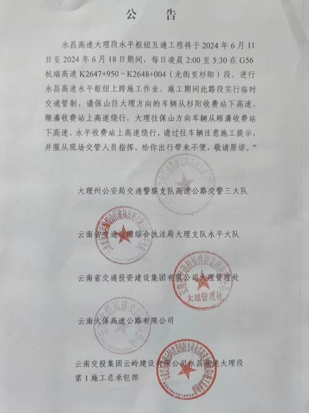 永昌高速大理段永平枢纽互通工程于2024年6月11日至2024年6月18日期间,每日凌晨2:00至5:30在G56杭瑞高速K2647+950~K2648+004(龙街至杉阳)段,进行永昌高速永平枢纽上跨施工作业,施工期间此路段实行临时交通管制,届时请保山往大理方向的车辆从杉阳收费站下高速、顺濞收费站上高速绕行,大理往保山方向的车辆从顺濞收费站下高速、永平收费站上高速绕行,请过往车辆注意施工提示,并服从现场交管人员指挥,给你出行带来不便,敬请原谅。