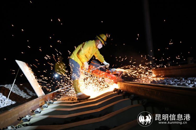“白进永,你带人把防风布拉起来。”为保障焊接过程钢轨接头受热均匀,念建频现场指挥着。一旁,昆明工务机械段换轨大修车间焊轨车车长段秀闪一边盯着焊轨仪器的电子显示屏,一边注视着钢轨的变化,“十秒、五秒、好。”随着一声“好”字落地,火焰瞬间熄灭,推瘤刀缓缓推除焊瘤,钢轨接头处融为一体,气压焊主体作业结束。待冷却、正火等流程陆续收尾后,2台仿型打磨机迅速就位,在黑暗的夜空中绽放出绚烂的“烟花”,打磨形成一条坚固、平整的无缝线路。
