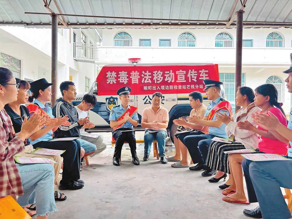 在第37个国际禁毒日来临之际,畹町边检站芒线分站组建宣传普法小分队,采用民警搭台、流动宣传、全民参与的形式,开展国际禁毒日普法宣传活动,把禁毒知识送进学校、企业、社区村寨,提高群众识毒、防毒、拒毒意识。