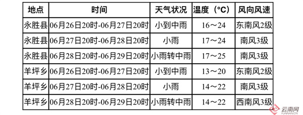 6月26日,为做好应急气象服务工作,云南省气象局发布丽江市永胜县羊坪彝族乡地震专题天气预报。