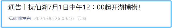 6月26日,抚仙湖发布关于抚仙湖2024年开湖捕捞的通告,自2024年7月1日中午12:00起,至2024年12月31日中午12:00止,抚仙湖开湖捕捞。