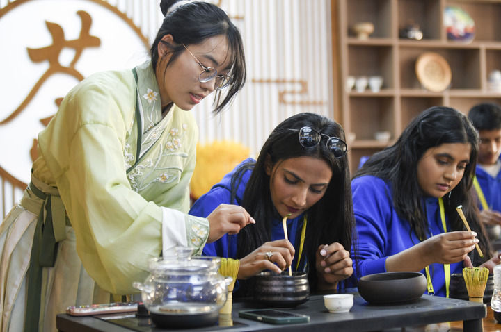 2024年4月15日,参加2024年“汉语桥”上合组织国家青年学生春令营的来华青年学生在新疆师范大学学生(左)的指导下学习茶艺。新华社记者 王菲 摄