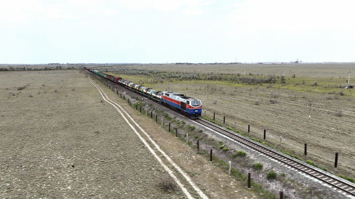 2023年5月12日,在哈萨克斯坦阿拉木图附近,货运列车驰骋于阿拉木图与中国霍尔果斯间(无人机照片)。新华社发(奥斯帕诺夫摄)