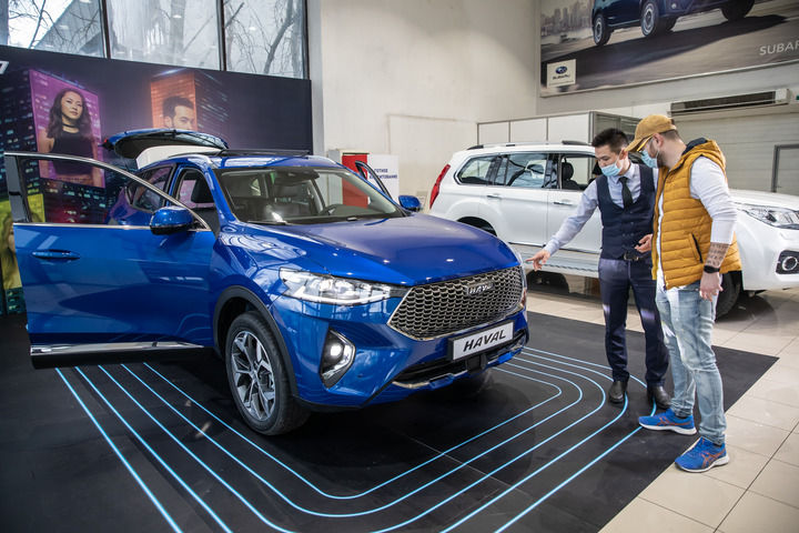 2021年4月1日,销售人员在哈萨克斯坦阿拉木图市经销商店向消费者介绍哈弗汽车。新华社发(阿斯塔纳汽车公司供图)