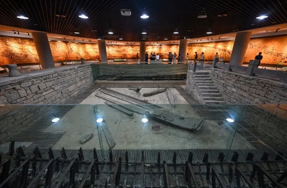 (这艘唐代货船,出土时船头缺损,只留下部分船身,加上尾部拖舵总长12.6米,大运河繁忙的通航能力由此可见一斑。)