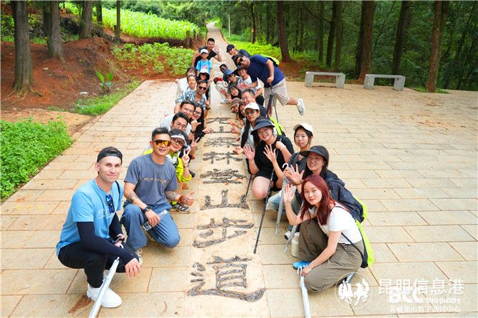 参加活动的中外朋友在龙山森林登山步道字样处合影。供图