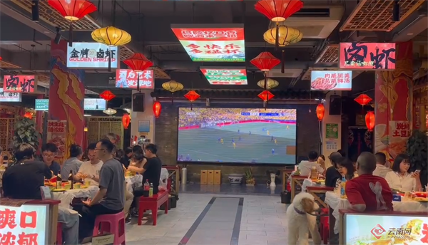 作为昆明新晋网红夜市,位于昆明大悦城的春城之夜内,商家也为球迷们提供了多个观赛大屏,其中,公路酒吧和天幕夜市大屏较为醒目。据该夜市运营方工作人员介绍,最近一段时间,无论是夜市内的酒吧还是餐饮机构,受欧洲杯的影响人气都有所上升。
