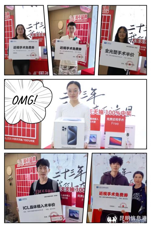 1.24周年惊喜盲盒,免费近视手术名额,大额摘镜减免券,苹果、华为笔记本电脑,iPhone15pro,名牌骑行镜、墨镜,超多福利天天抽,中奖率100%。