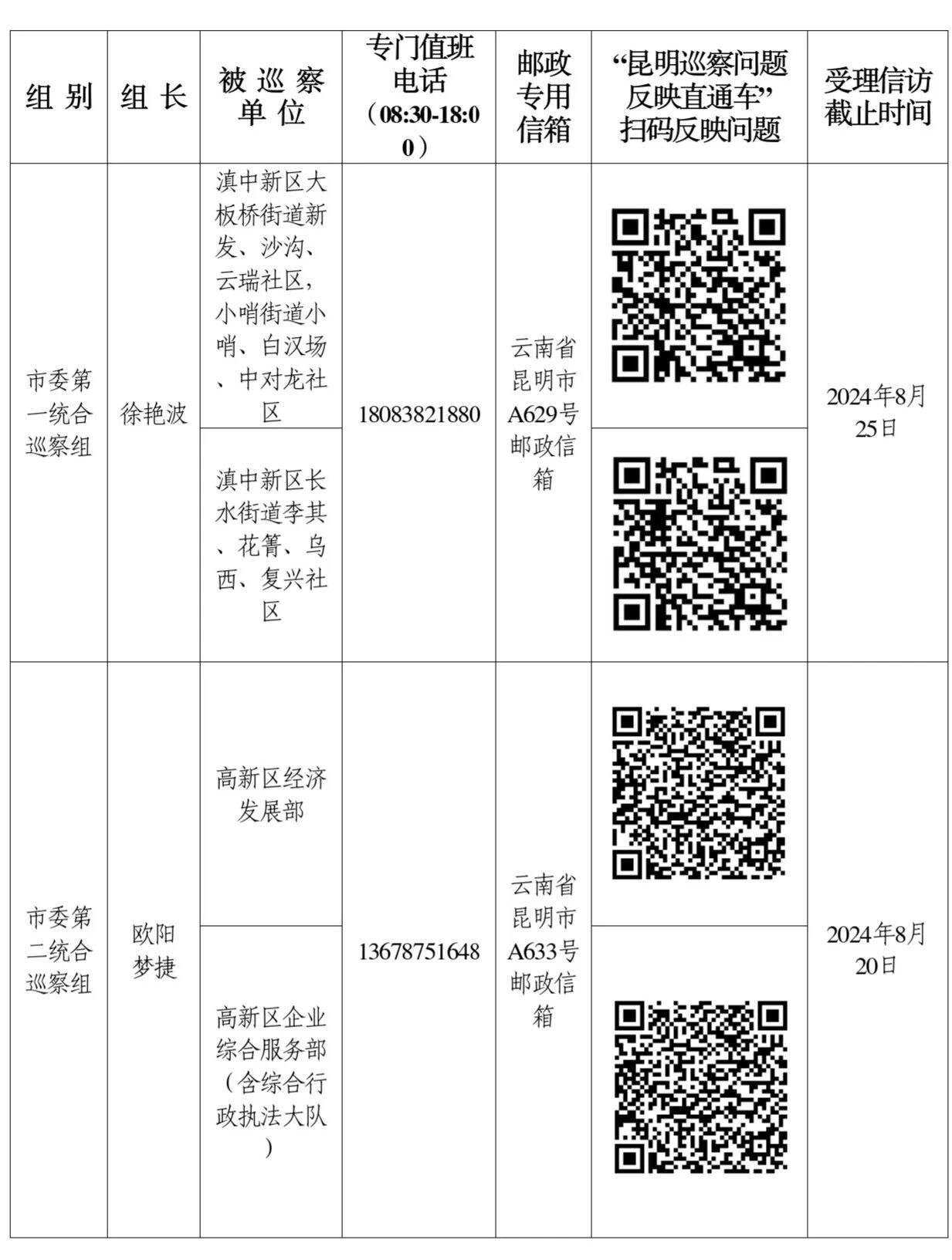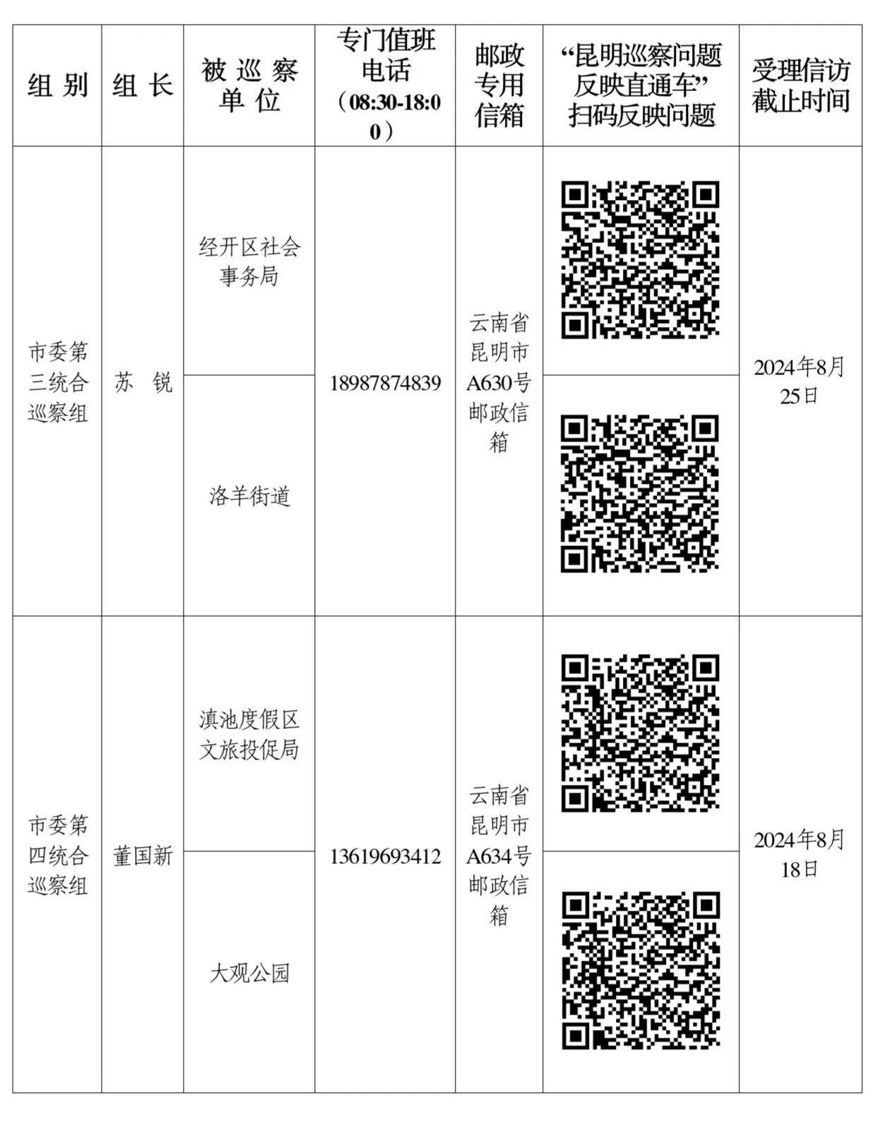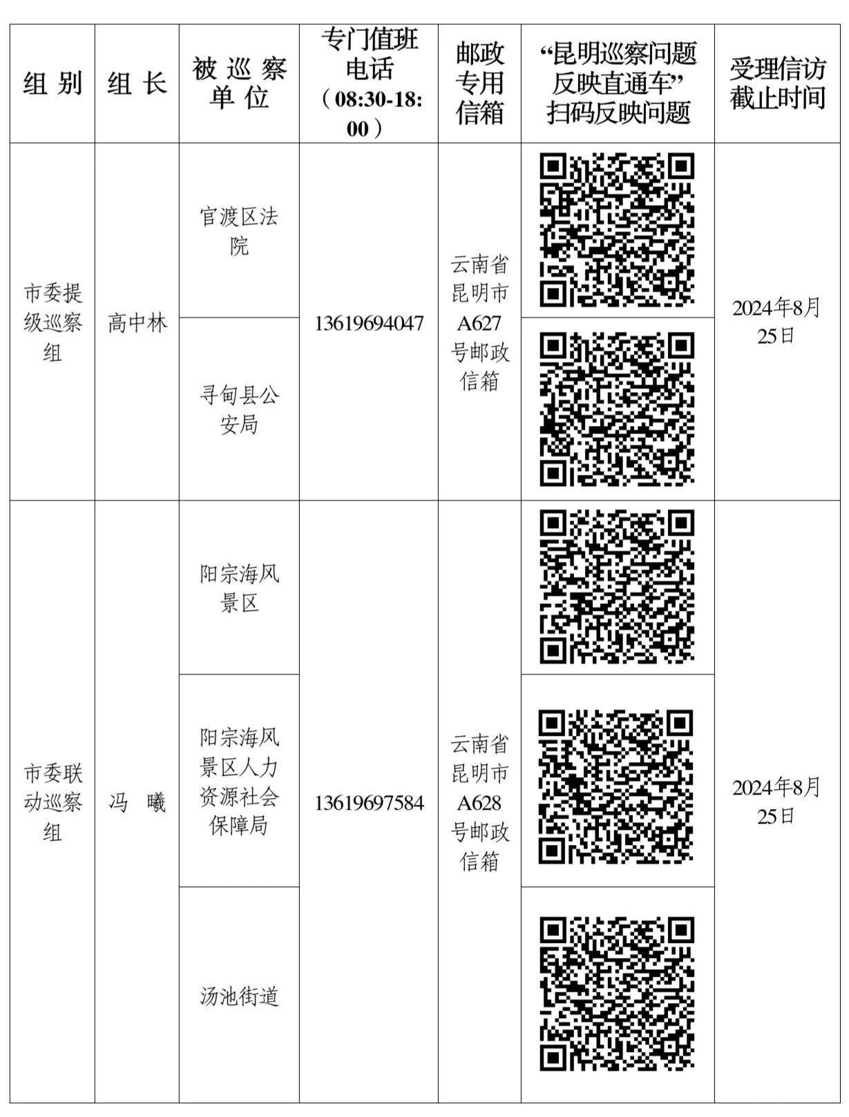 市委巡察组现场巡察时间为40-45天左右。巡察期间开通“昆明巡察问题反映直通车”,可扫码反映问题。设置专门值班电话和专用邮政信箱,主要受理反映被巡察单位领导班子及其成员、下一级党组织主要负责人和重点岗位人员问题的来信来电来访,重点是违反政治纪律、组织纪律、廉洁纪律、群众纪律、工作纪律、生活纪律等方面的问题反映。其他不属于巡察受理范围的信访问题,将按规定转有关部门办理。