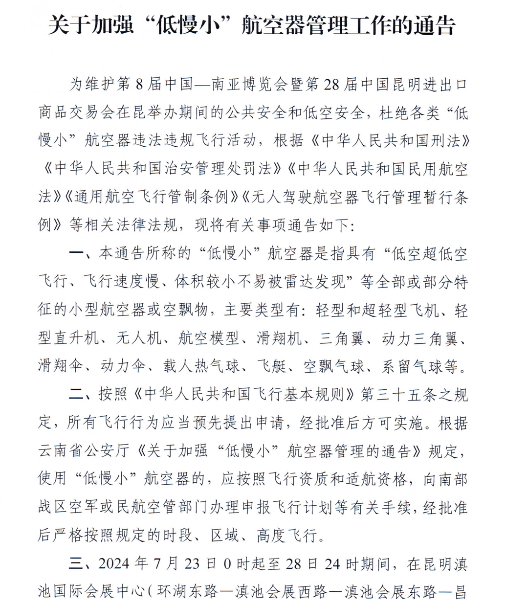 2024年7月23日至28日,第8届中国-南亚博览会暨第28届中国昆明进出口商品交易会在昆明市举办。为保障南博会期间公共安全和低空安全,昆明公安发布《关于加强“低慢小”航空器管理工作的通告》。