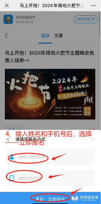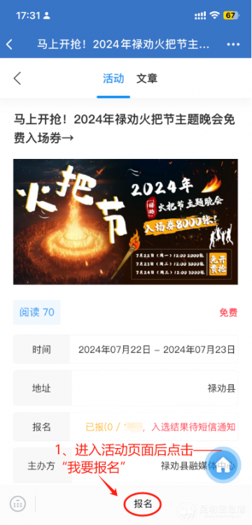 活动参与方式包括关注“魅力禄劝”微信公众号,点击菜单栏的“抢票”按钮进入;或关注禄劝融媒APP或昆明信息港彩龙社区,找到相关活动入口进入,随后点击“我要报名”即可。