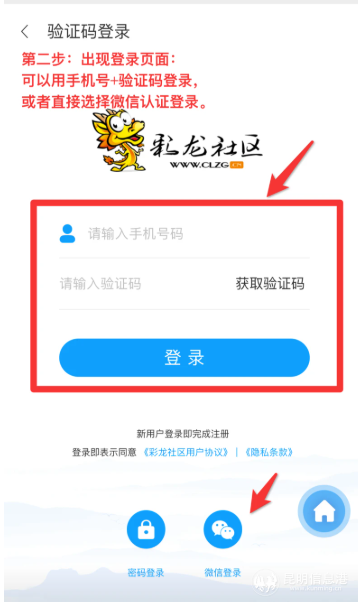 2、随后出现登录页面——可以用手机号+验证码登录,或者直接选择微信认证登录